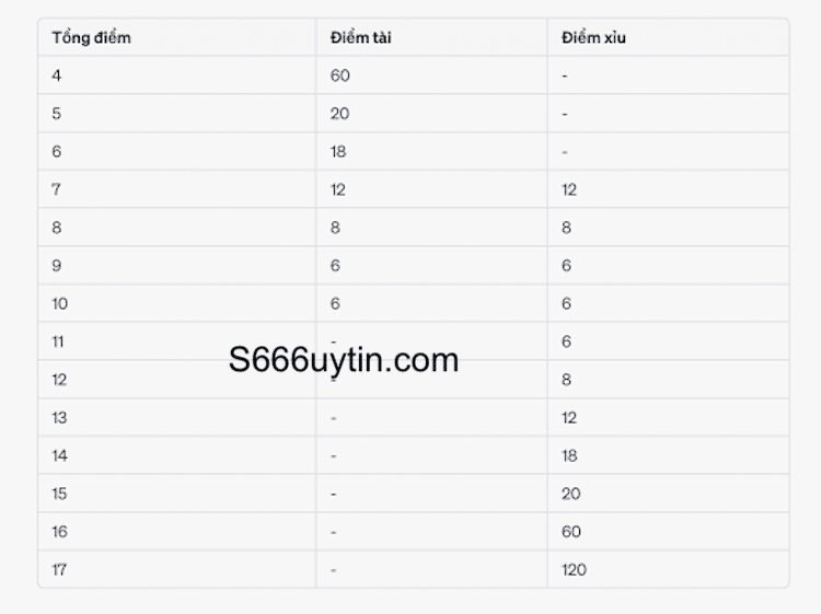 Ví dụ, đây là bảng điểm tài xỉu thông thường: